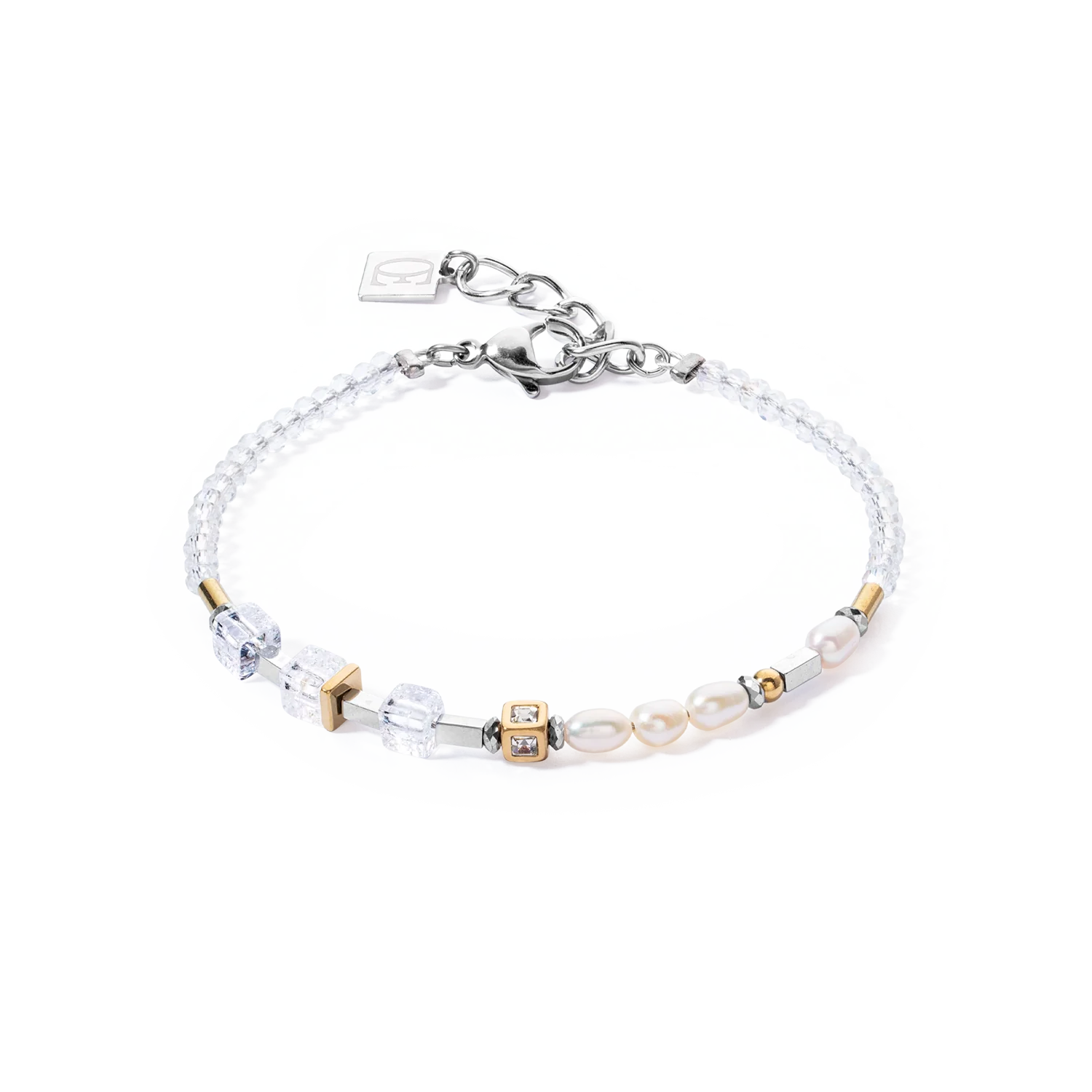 The delicate Princess Fusion Pearls bicolour bracelet - in an asymmetric design for every day. Here, cool rock crystal cubes combine with soft oval freshwater pearls to create a perfectly coordinated dialogue between cubist clarity and romantic pearl shimmer. Combine this bracelet with other bracelets or bangles from our collection.Every piece of jewellery ordered from COEUR DE LION will be delivered to you in a premium designer case and with a certificate of authenticity.