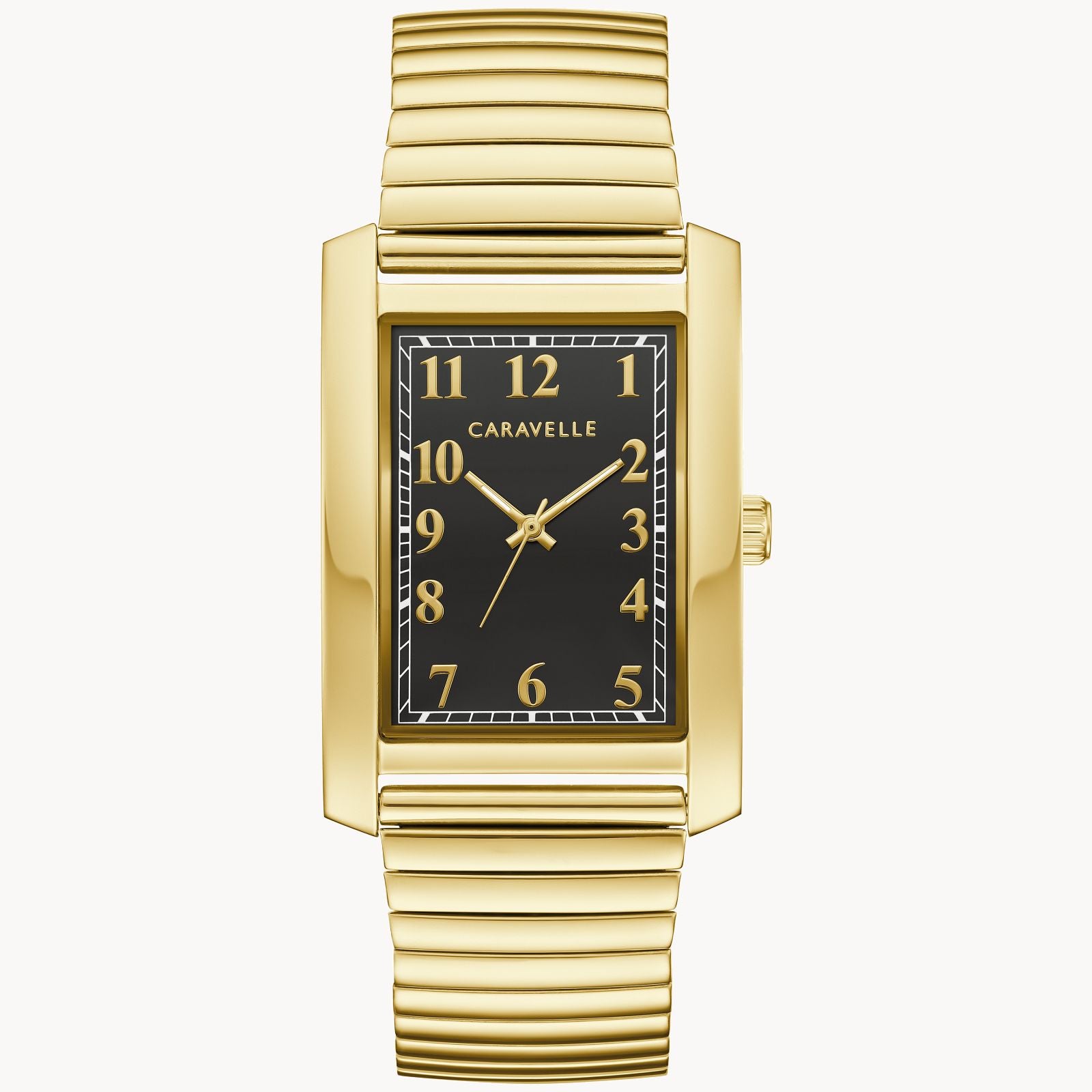 Sophisticated styling to easily transition from day to night. Gold-tone stainless steel tank shaped case with a black Arabic style easy-to-read dial and added dimension with a curved mineral crystal. Gold-tone stainless steel comfort-fit expansion bracelet.