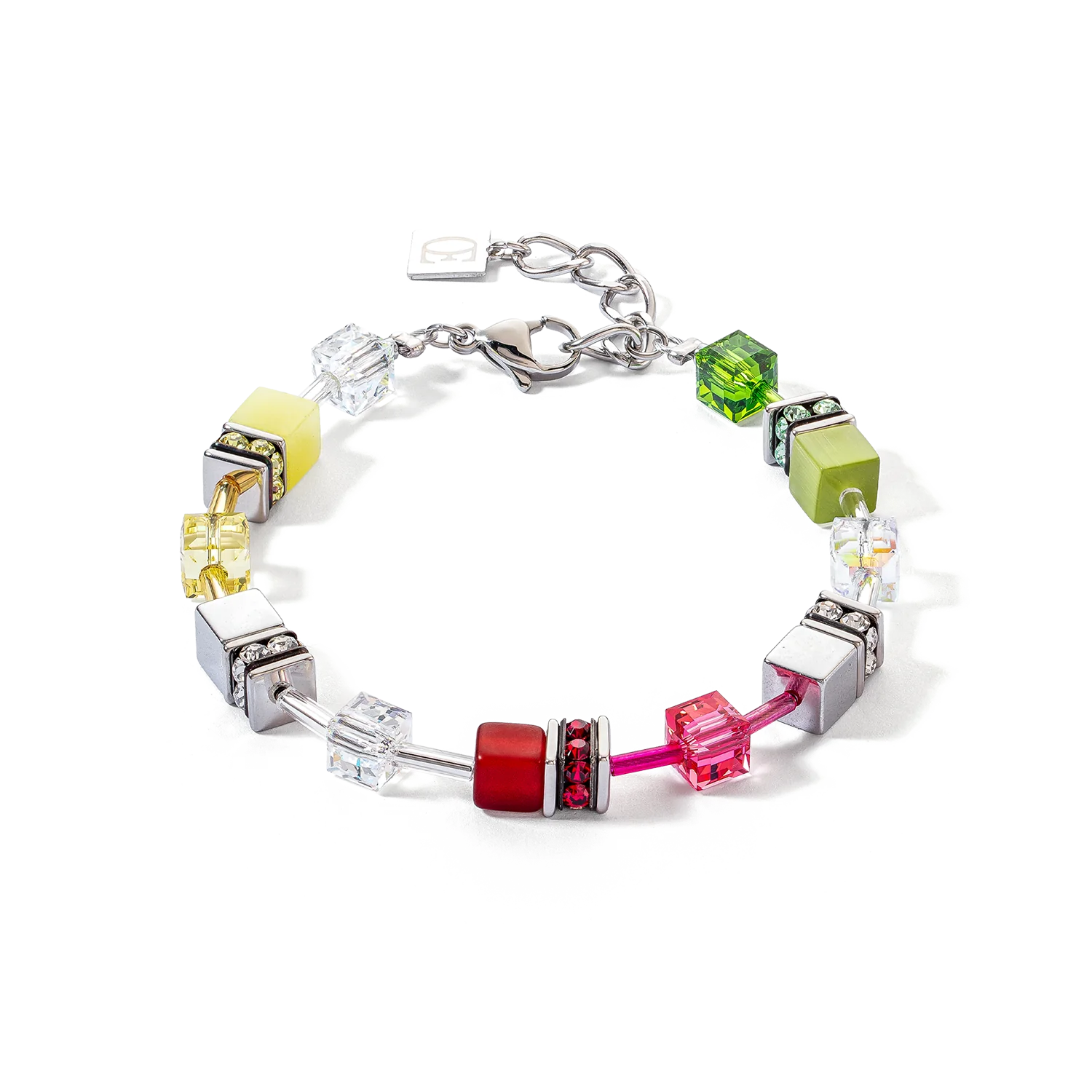 GeoCUBE® Iconic bracelet red-green: a touch of summer on your wrist The GeoCUBE® Iconic bracelet in red-green is the ideal addition to your jewellery set. In fresh sorbet colours reminiscent of cherry, kiwi and lemon, this bracelet brings a touch of summer to your wrist. Framed by silver and crystal clear cubes, it exudes a perfect balance of vibrancy and sophistication. Wear it alone or in combination with the matching necklace and earrings to add a colourful, stylish touch to your look. Every piece of jewellery ordered from COEUR DE LION will be delivered to you in a premium designer case and with a certificate of authenticity.