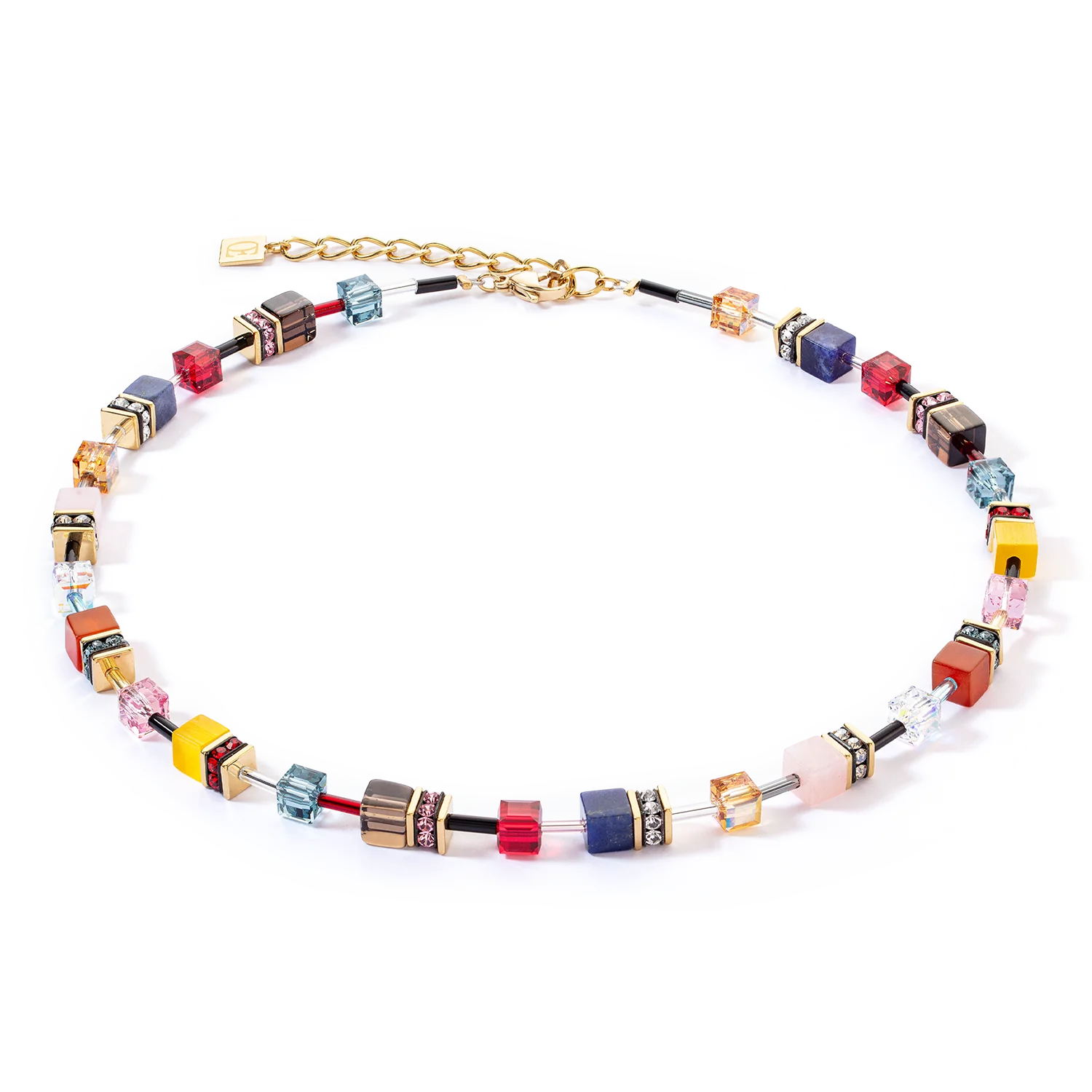 GeoCUBE® Iconic Precious Necklace Energy - Powerful colour accents with meaningful gemstones The GeoCUBE® Iconic Precious Necklace Energy is a vibrant statement of colours and gemstones that not only enhances your outfits, but also positively influences your energy. This unique piece of jewellery combines the power of four meaningful gemstones in a harmonious composition: Smoky quartz: A stone of clarity and grounding that helps to reduce negative energies and find inner balance. Sodalite: Symbolises clarity and rationality, supports communication and promotes self-expression. Carnelian: Known as the stone of vitality and zest for life, carnelian boosts motivation and brings passion into your life. Rose quartz: The stone of love and compassion, helping to promote emotional healing and create harmony. The colourful GeoCUBES® made from these genuine gemstones are artfully set in a necklace that serves as a radiant eye-catcher both in everyday life and on special occasions. The combination of intense colours and the deep meanings of the stones gives this necklace a special radiance and energy. With the GeoCUBE® Iconic Precious necklace Energy, you are not only wearing a fashion accessory, but also a piece of positive energy and symbolic power. A must-have for anyone who appreciates jewellery with deep meaning and stylish elegance. Every piece of jewellery ordered from COEUR DE LION will be delivered to you in a premium designer case and with a certificate of authenticity.