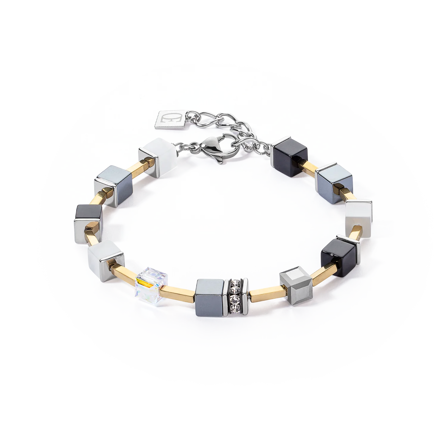 The timeless beauty of the GeoCUBE® Iconic Pure bracelet in black-gold is reflected in the masterful combination of the classic GeoCUBE® Iconic sequence with a modern, purist sequence.The GeoCUBE® Iconic Pure necklace and the Brilliant Square small silver crystal ear studs are available to match.