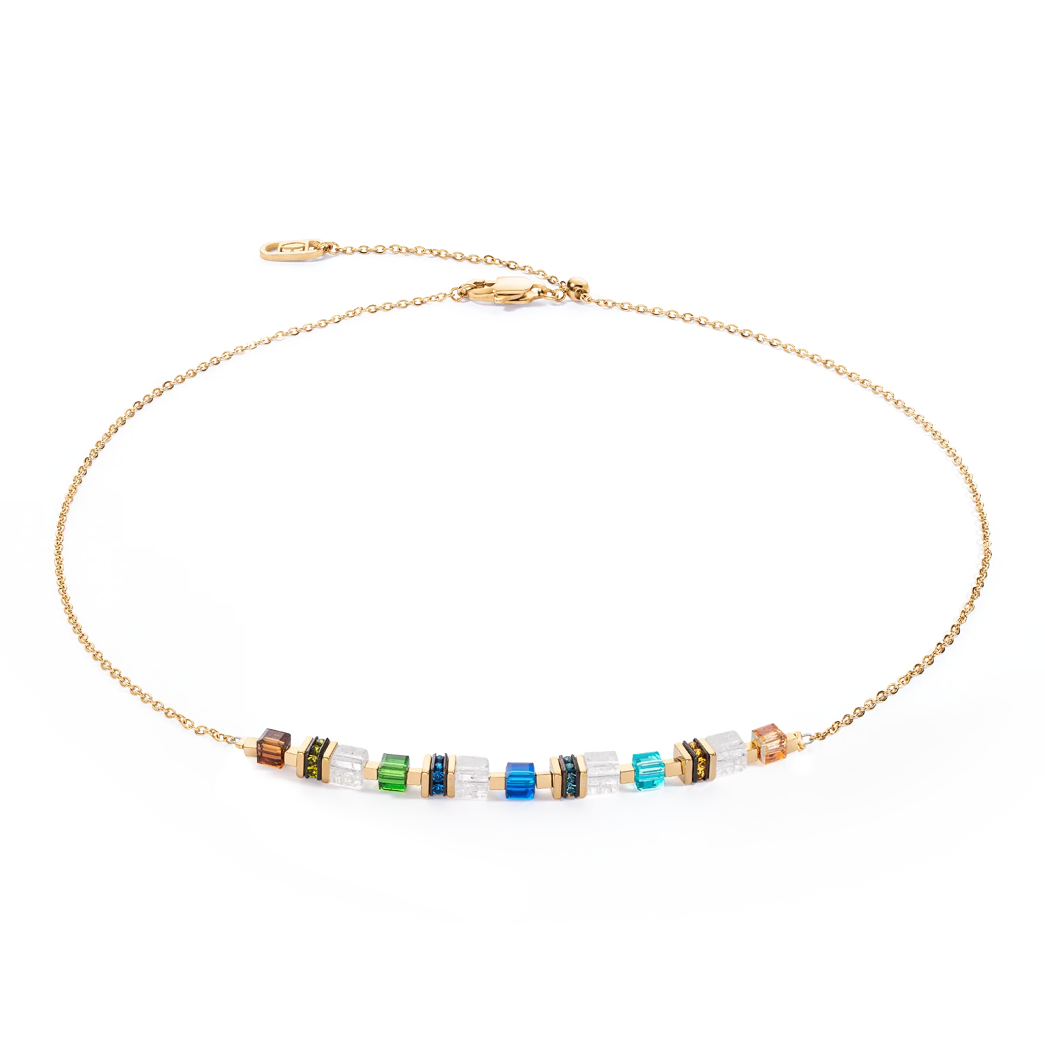 Delight in the simple elegance of our Mini Cubes & Chain necklace in gold multicolour - a sophisticated piece of jewellery that enchants with its delicate design and the unique charm of the materials. This piece of jewellery combines the timeless beauty of real stone cubes such as rock crystal with the dazzling brilliance of Swarovski crystals. The innovative sliding clasp ensures a customised fit and allows you to adjust the length of the chain as desired, ensuring optimum comfort and versatile styling options. Every piece of jewellery ordered from COEUR DE LION will be delivered to you in a premium designer case and with a certificate of authenticity.