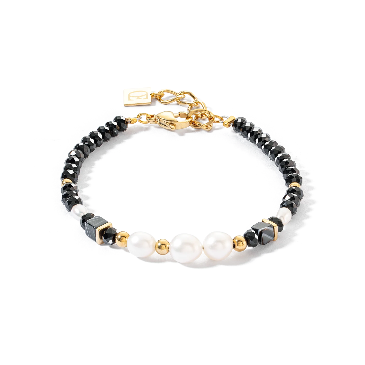 Pearls & Onyx bracelet - stylish sophistication in Art Deco design The Pearls & Onyx bracelet is a masterpiece of Art Deco inspiration. It combines oval freshwater pearls with geometric striped onyx cubes, which are perfectly set off by sparkling black crystal beads and luxurious golden accents. This bracelet is more than just a piece of jewellery - it is a statement of stylish sophistication and timeless elegance, ideal for any occasion.